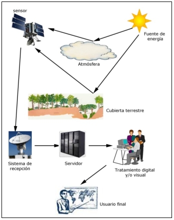La Teledetección se refiere a la adquisición de información de un objeto sin que exista contacto material entre el objeto o sistema estudiado y el observador. Incluye la técnica de adquisición y posterior tratamiento de datos de la superficie terrestre desde sensores instalados en plataformas espaciales, basados en la interacción electromagnética existente entre la Tierra y el sensor, siendo la fuente de radiación proveniente del sol (pasiva) o del propio sensor (activa).