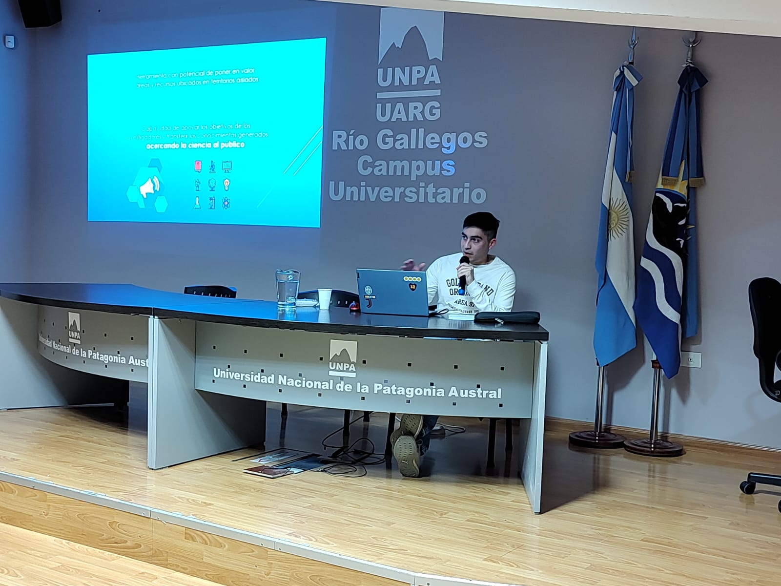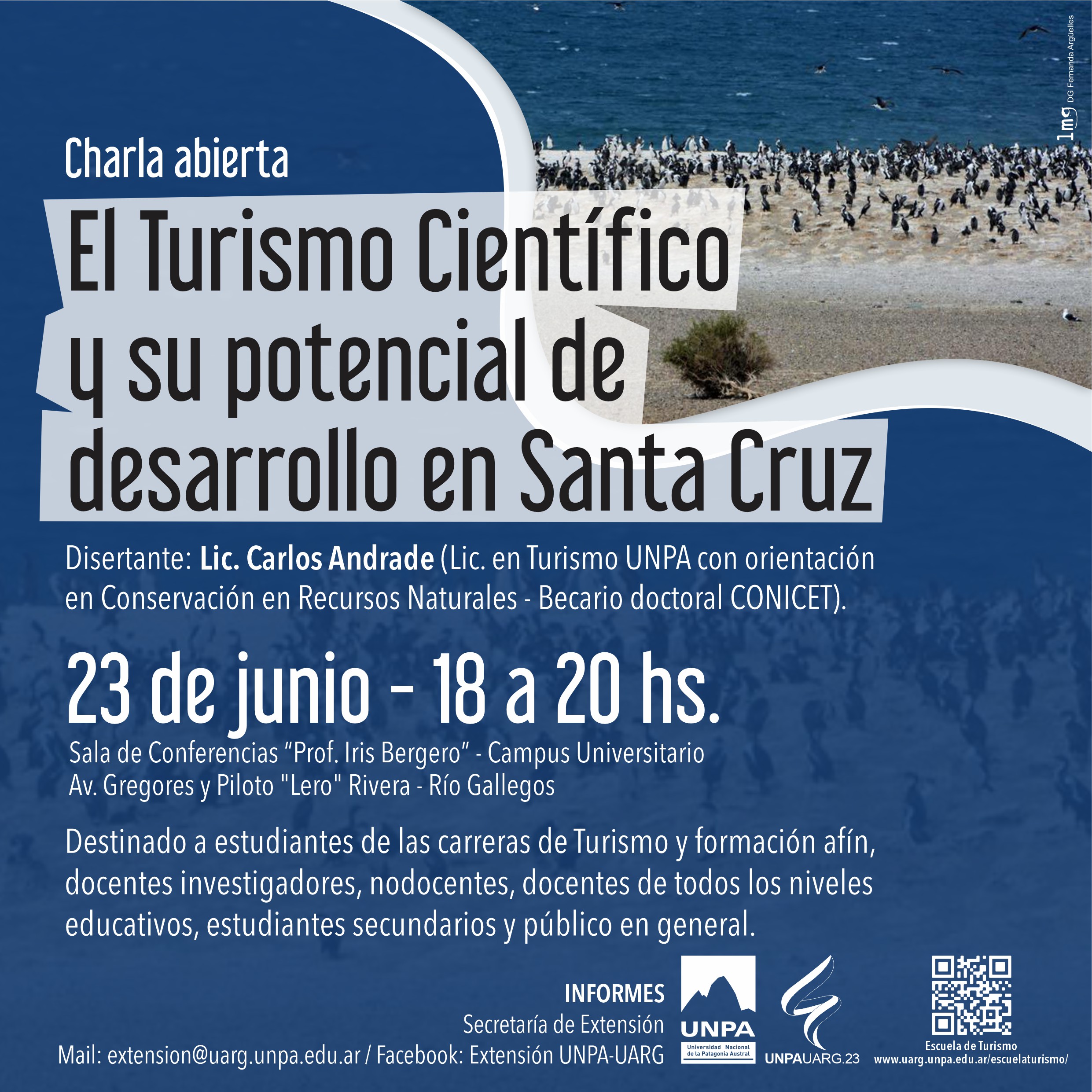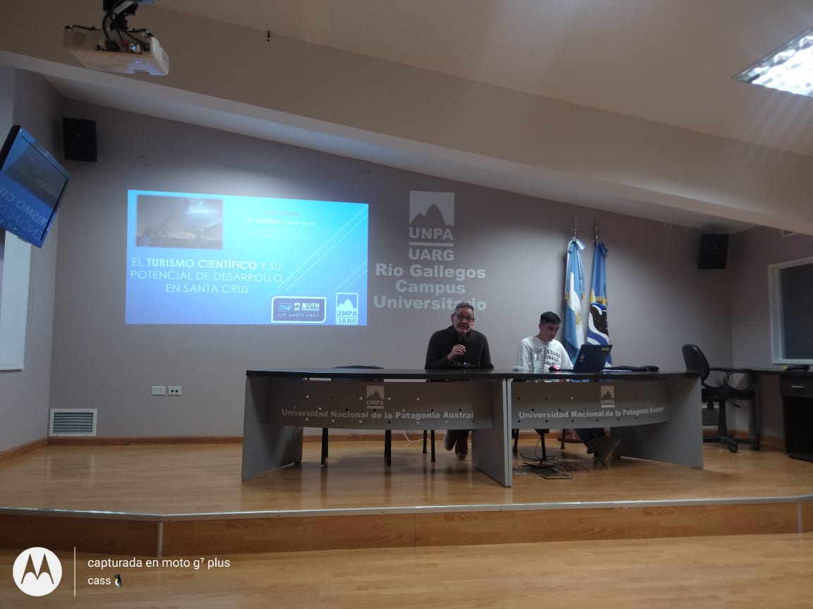 El pasado viernes 23 de junio a las 18 horas se llevó a cabo en la Sala de conferencia "Prof. Iris Bergero" la charla abierta de Turismo Científico a cargo del Lic. Carlos Andrade, quien es Lic. en Turismo graduado de la UNPA con orientación en Conservación en Recursos Naturales y becario doctoral CONICET.