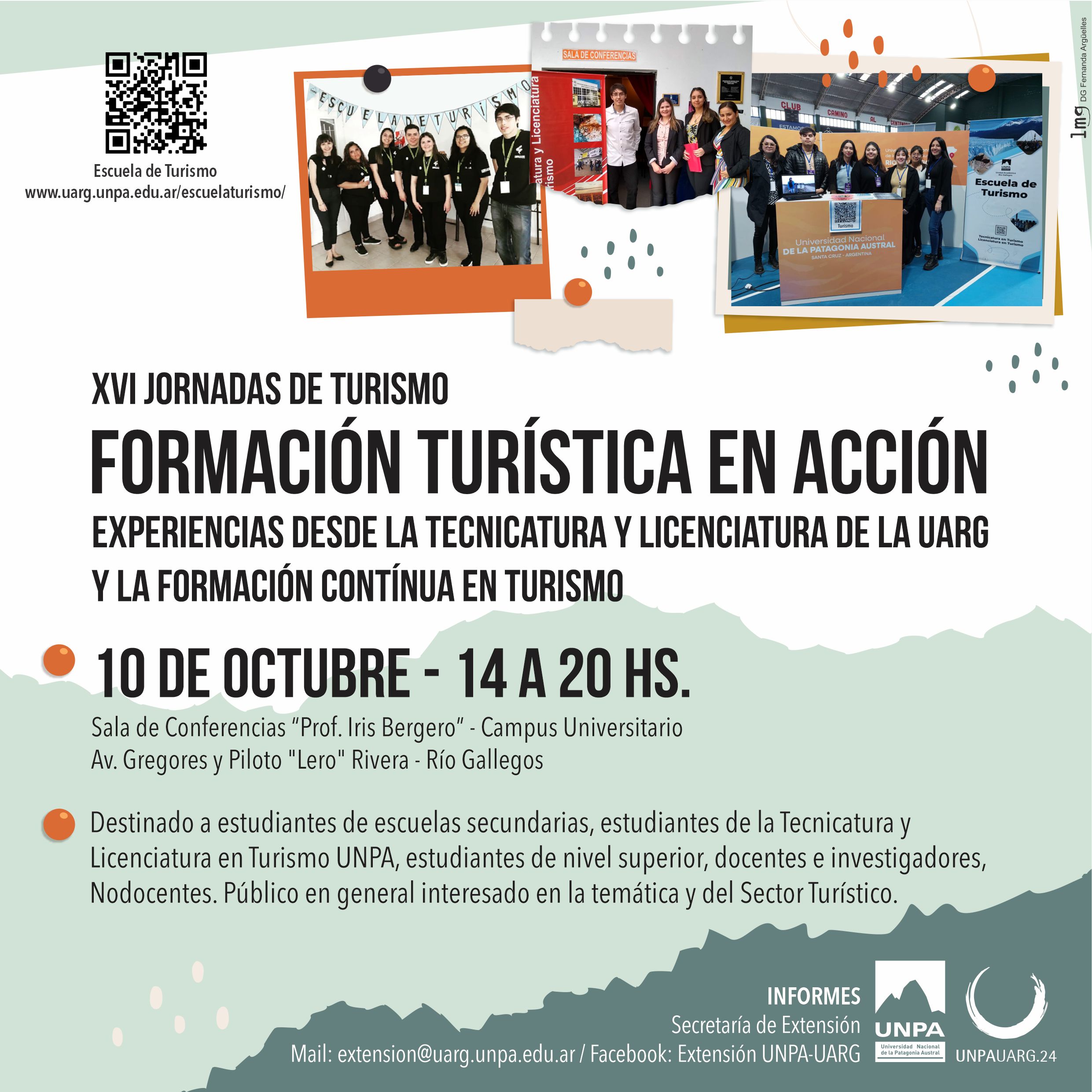 La Escuela de Turismo, Unidad Académica Río Gallegos (UARG) de la Universidad Nacional de la Patagonia Austral (UNPA), llevará a cabo las XVI Jornadas de Turismo bajo el lema "Formación Turística en Acción: Experiencias desde la Tecnicatura y Licenciatura de la UARG y la Formación Continua en Turismo". El evento tendrá lugar el jueves 10 de octubre, de 14 a 20 horas, en la Sala de Conferencias "Prof. Iris Bergero” Campus Universitario (Av. Gregores y Piloto "Lero" Rivera).